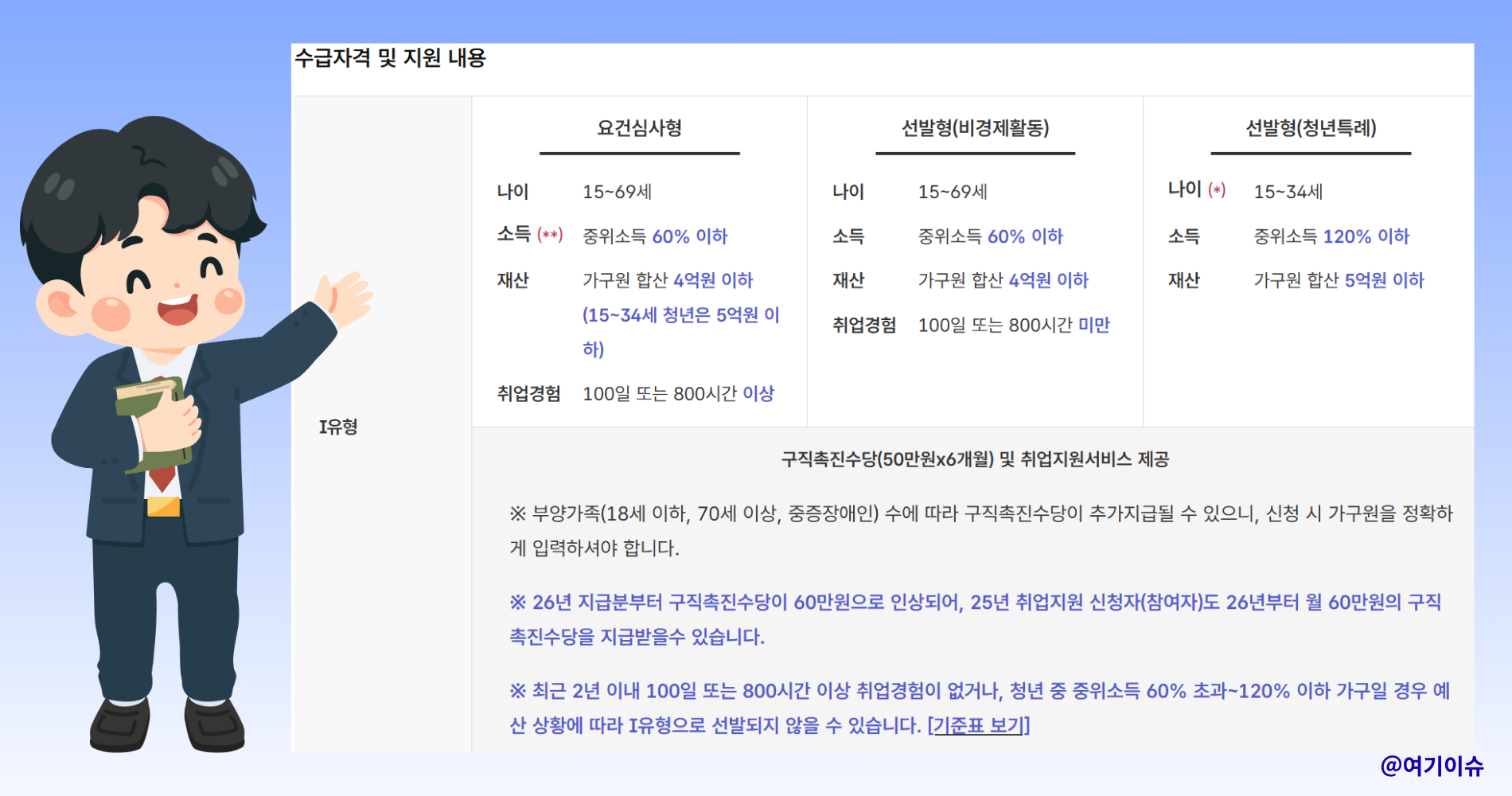 • 요건심사형 : 15~69세 구직자 중 가구 소득이 기준 중위소득 60% 이하여야 하며, 재산은 4억 원 이하여야 합니다.